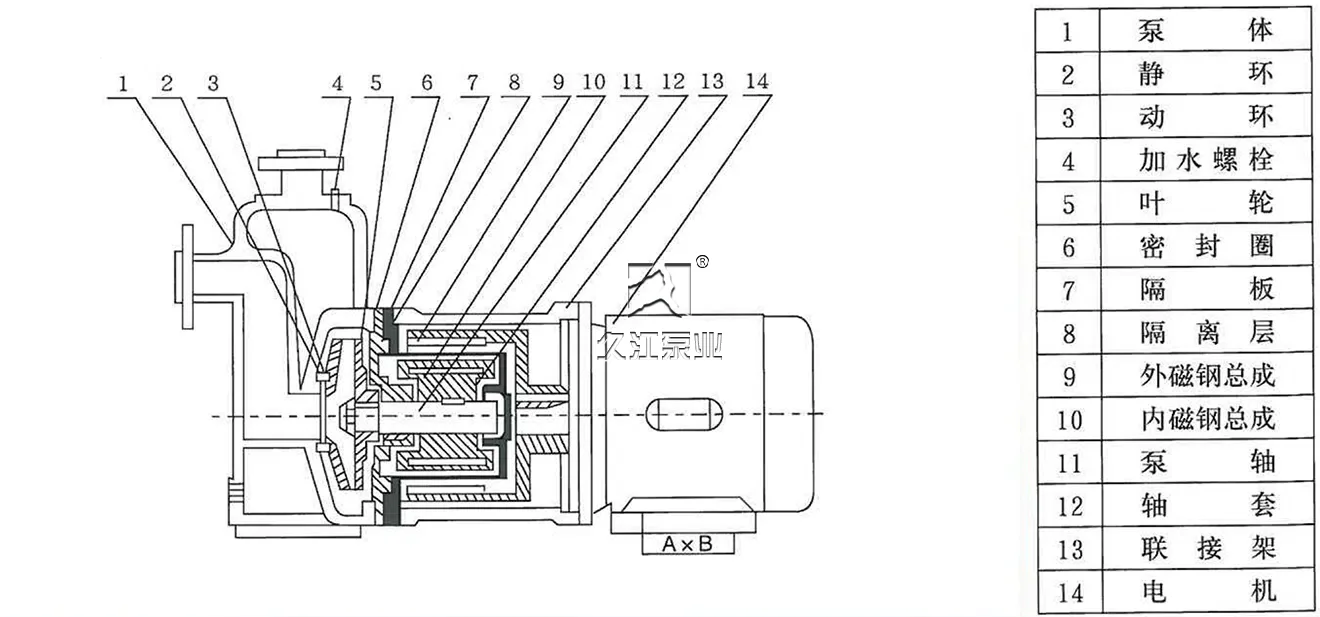 該泵以靜密封取代動密封,使泵的過流部件處于完全密封狀態,徹底解決了其它泵機械密封無法避免的跑、冒、滴、漏之弊病,泵體及過流部件的材料均采用了耐腐蝕的不銹鋼、鋼玉陶瓷、四氟石墨等材料制造,既有CQ型磁力驅動泵的功能,又集自吸于一身,不需底閥和引灌水,自吸高度4米。
