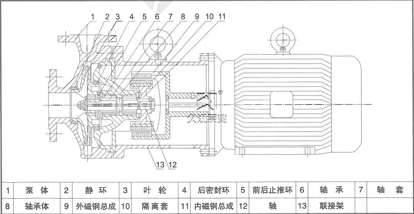 磁力驅動離心泵(簡稱磁力泵),通常由電動機、磁力偶合器和耐腐蝕離心泵組成。其主要特點是利用磁力偶合器傳遞動力,實現無泄漏。當電動機帶動磁力偶合器和外磁鋼旋轉時,磁力線穿過間隙和隔離套,作用于內磁鋼上,使泵轉子與電動機同步旋轉,無機械接觸地傳遞扭矩。在泵軸的動力輸入端,由于液體被封閉在靜止的隔離室內,沒有動密封,因而實現無泄漏。