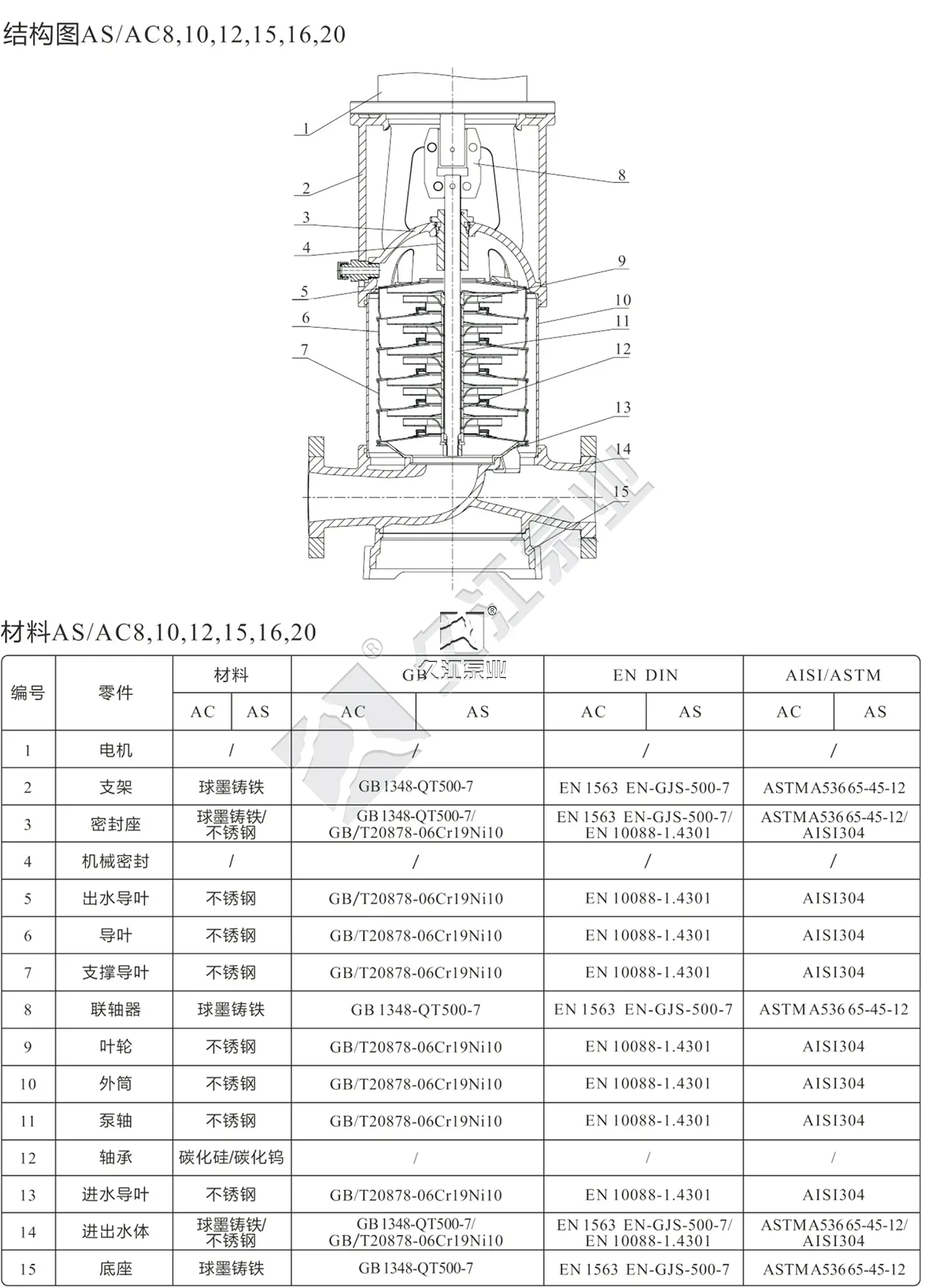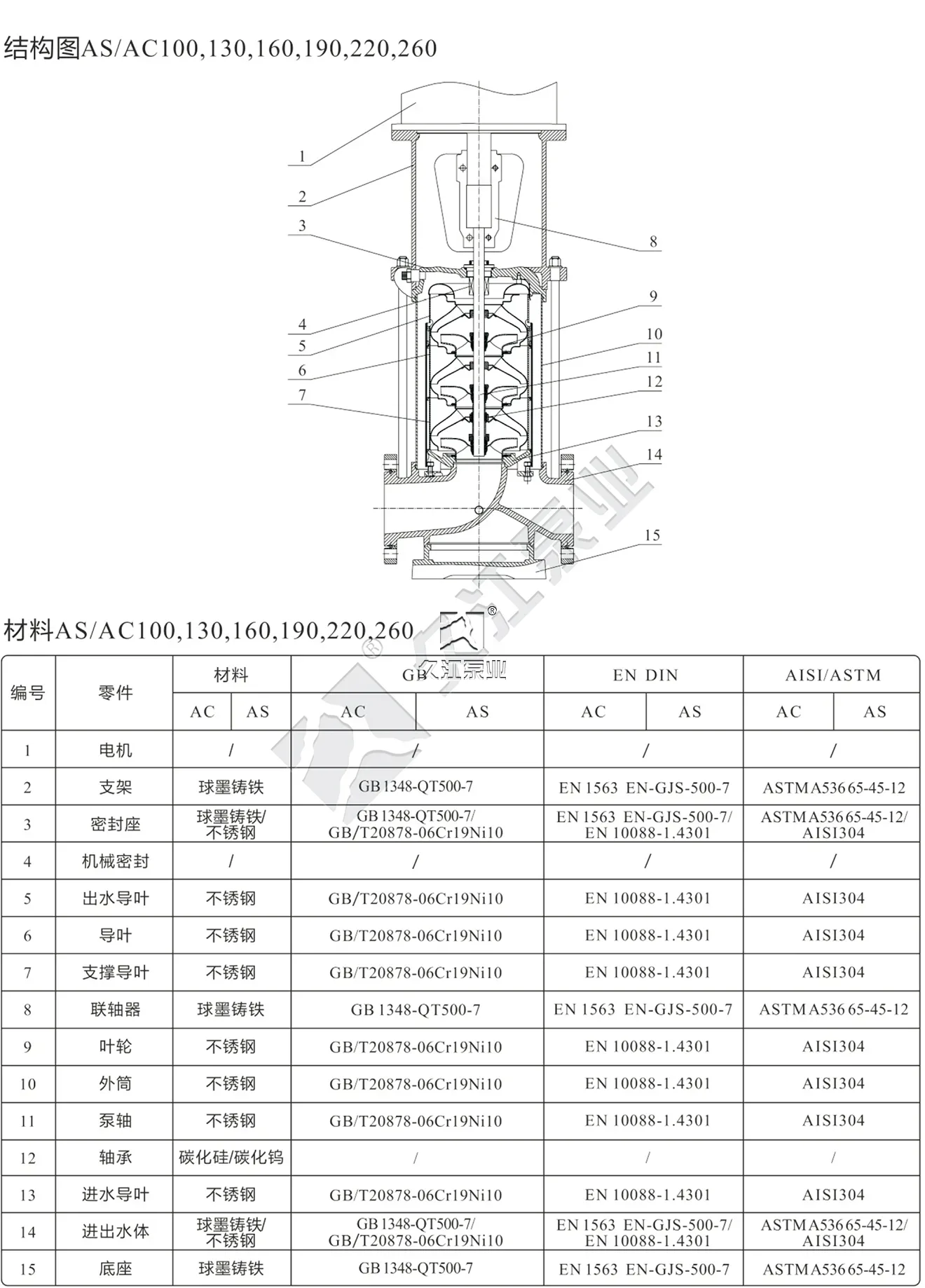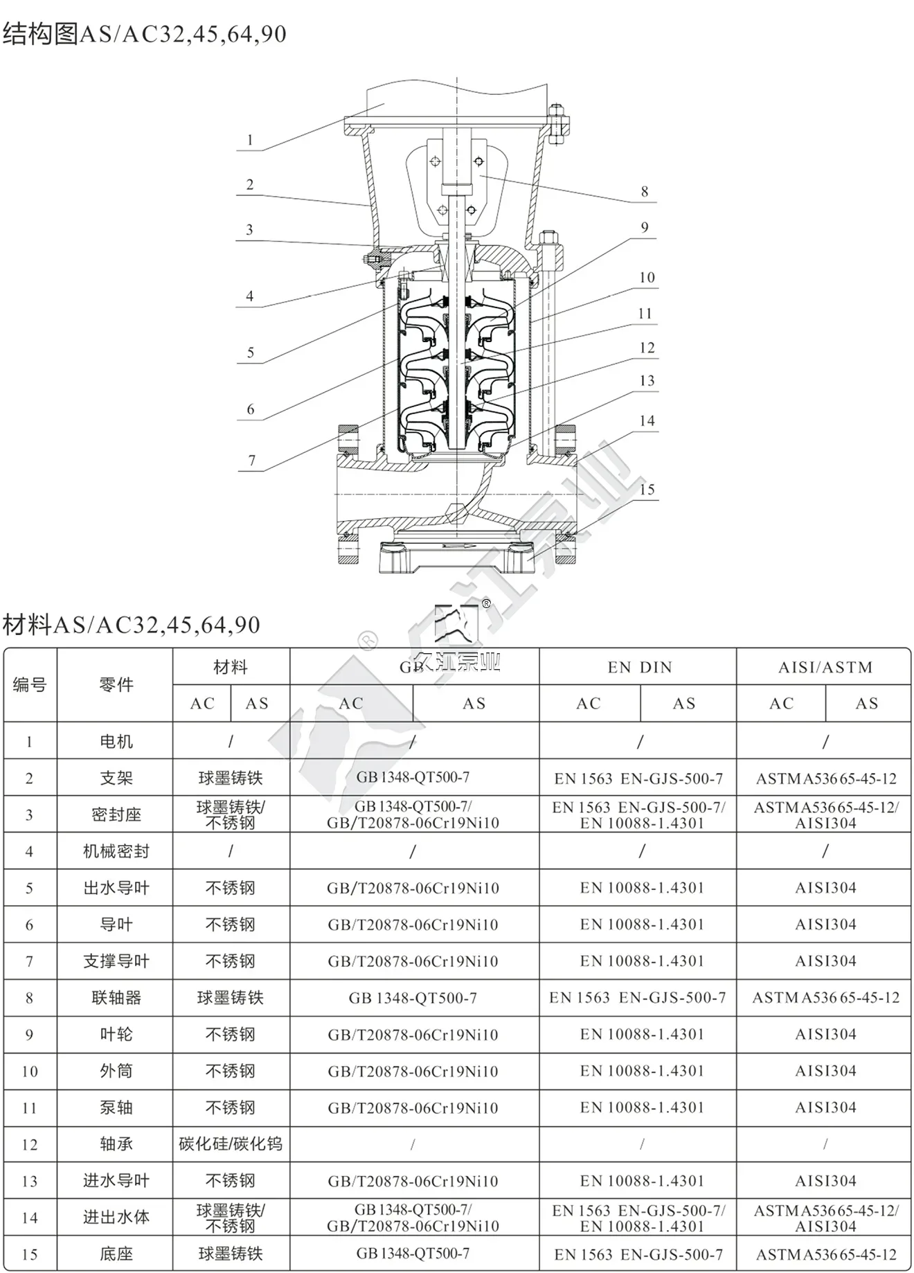 AS、AC 是一款高效節能的立式多級離心泵,通過旋轉泵的葉輪產生的離心力帶動流體運動來完成液體的輸送,主要由主軸、葉輪、導葉、泵殼、機械密封組合成的泵體與電機連接構成。