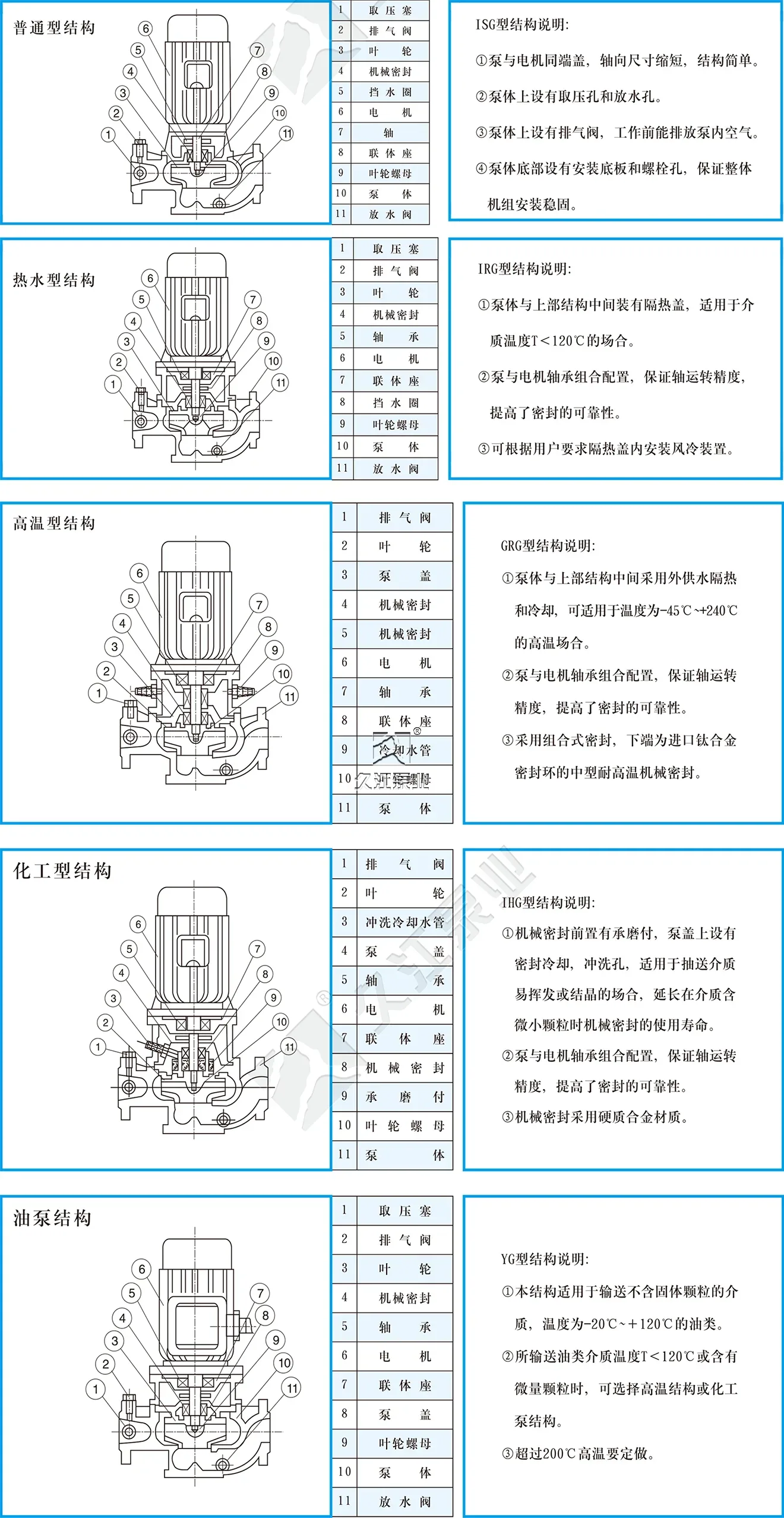 2、IRG(GRG)型立式熱水(高溫)循環(huán)泵,適用于能源、冶金、木材加工、化工、紡織、造紙及飯店、浴室、賓館等鍋爐熱水增壓循環(huán)輸送及城市采暖系統(tǒng)循環(huán)用泵,IRG使用介質(zhì)溫度不超過120℃,GRG型使用介質(zhì)溫度不超過240℃。